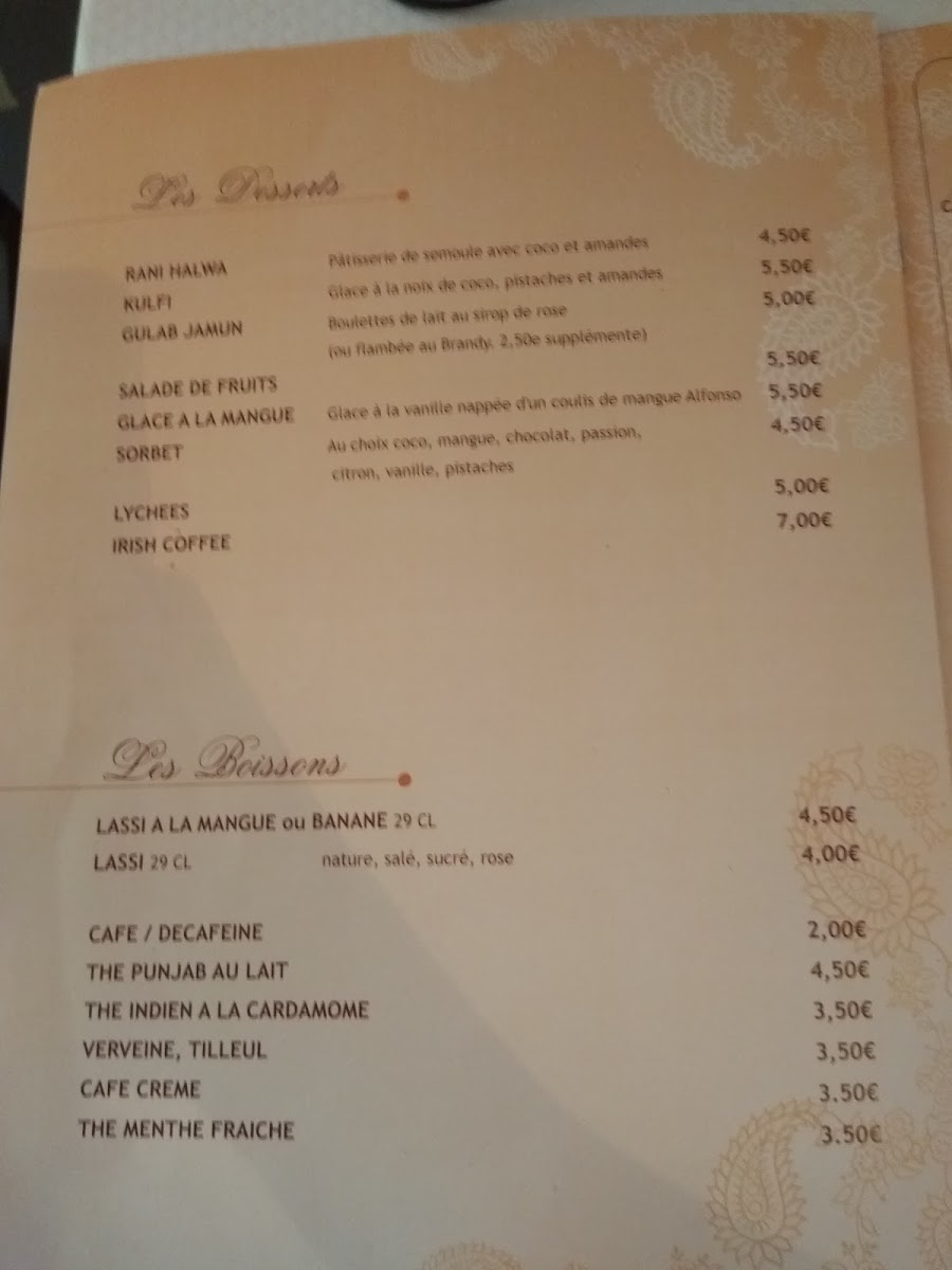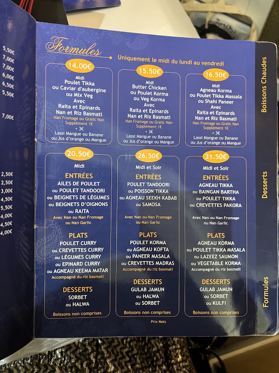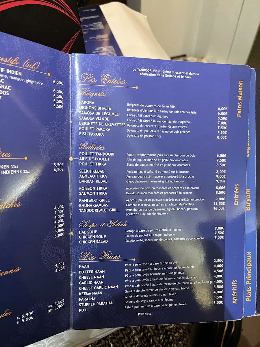 The menu at this Indian and South Asian restaurant in Paris offers a diverse selection of traditional dishes and popular drinks, reflecting authentic regional flavors. Guests can expect a variety of savory options including vegetarian and meat-based main courses such as korma, tandoori chicken, and biryani. Complementary breads like cheese naan and accompaniments including raita and spinach are also available, providing balanced meal choices.